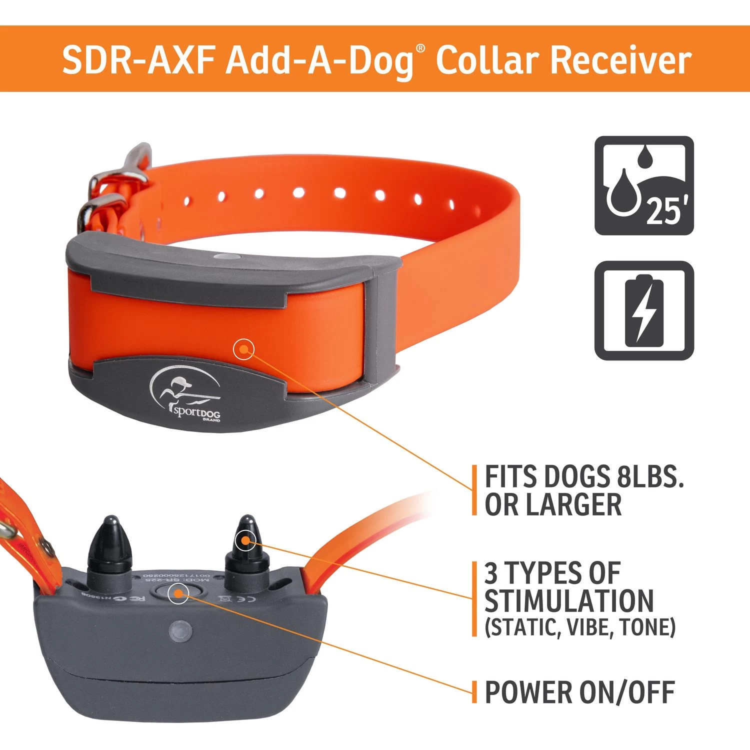 The Collar Receiver for FieldTrainer® 425X, SportHunter® 825X and SportTrainer™ 575E/875E Remote Trainers. Add another dog to your current SportDOG Brand® electronic training collar system or replace a Collar Receiver with the SDR-AFX Add-A-Dog® Receiver Collar.